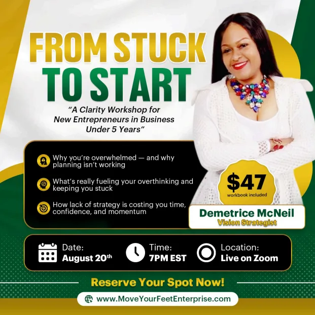 Demetrice "Coach Dee" McNeil is a Vision Strategist, author, and founder of Move Your Feet Enterprise. She specializes in helping new women entrepreneurs get unstuck by equipping them with structure, strategy, and clarity to finally move forward from idea to implementation with confidence. If you’ve been circling your vision… it’s time to build what you’ve been sitting on.